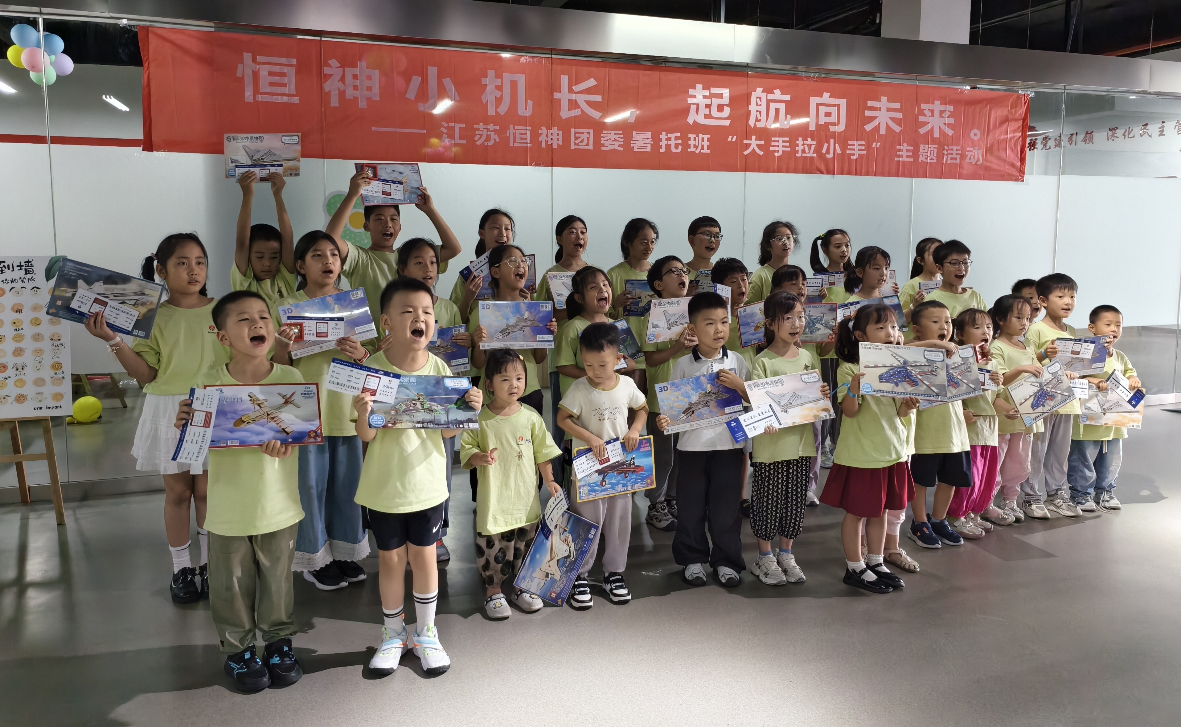 8月12日下午,恒神股份愛心暑托班的活動(dòng)場(chǎng)地變身歡樂航空港,約50名職工子女化身 “恒神小機(jī)長(zhǎng)”,在團(tuán)委青年們的帶領(lǐng)和陪伴下,開啟了一場(chǎng)充滿歡笑與成長(zhǎng)的航空主題奇妙之旅。這場(chǎng)以 “恒神小機(jī)長(zhǎng)?起航向未來” 為主題的趣味游戲活動(dòng),讓孩子們?cè)谳p松愉快的游戲中收獲了知識(shí)、初步建立了團(tuán)隊(duì)互助協(xié)作的觀念。開場(chǎng)破冰:舞蹈牽情誼,小隊(duì)齊集結(jié)隨著歡快的音樂旋律響起,活動(dòng)正式拉開帷幕。5名團(tuán)委青年與孩子們手拉手圍成圈,跟著節(jié)奏蹦跳旋轉(zhuǎn),原本有些靦腆的小朋友們很快被活潑的氛圍感染,大廳里瞬間充滿了銀鈴般的笑聲。這場(chǎng)破冰舞蹈就像一根無形的線,迅速拉近了青年志愿者與孩子們的距離。在簡(jiǎn)要的自我介紹后,大家通過抽取彩色手環(huán),分成了紅、黃、藍(lán)、綠、白五支小隊(duì),展開了一場(chǎng)場(chǎng)趣味比拼。趣味闖關(guān):航空主題游戲里的知識(shí)與協(xié)作折紙飛機(jī)環(huán)節(jié)迅速點(diǎn)燃了孩子們的激情。大家拿著 A4 紙,跟著領(lǐng)隊(duì)老師學(xué)習(xí)折疊技巧,有的還別出心裁地畫上笑臉和花紋。“三、二、一,起飛!” 當(dāng)數(shù)十架紙飛機(jī)穿過 “書架圓環(huán)” 時(shí),大廳里爆發(fā)出陣陣歡呼。“我是拼圖小能手” 環(huán)節(jié)堪稱對(duì) “速度與協(xié)作” 的考驗(yàn)。當(dāng)飛機(jī)拼圖被分發(fā)到各隊(duì)時(shí),孩子們立刻圍坐在一起,七手八腳地開始拼接?!斑@塊應(yīng)該在這里!”“不對(duì),看機(jī)翼的形狀!” 團(tuán)委志愿者們?cè)谂阅托囊龑?dǎo),既不包辦代替,又及時(shí)給迷茫的小隊(duì)員們支招。最終,各支隊(duì)伍都順利完成了拼圖任務(wù)。“飛機(jī)連連看” 游戲成了記憶力大比拼。孩子們盯著倒扣的紙牌,時(shí)而蹙眉思考,時(shí)而拍手歡呼,團(tuán)委志愿者們則在一旁計(jì)時(shí)鼓勁、還要熱心的小朋友不時(shí)用掌聲鼓勵(lì)加油。最終,所有孩子都贏得了木制飛機(jī)模型拼圖,獲勝隊(duì)伍的小朋友還優(yōu)先挑選了心儀的款式。溫情收尾:徽章與機(jī)票見證成長(zhǎng),愛與理念扎根心間活動(dòng)尾聲,每位小飛行員都領(lǐng)到了閃亮的 “恒神小機(jī)長(zhǎng)” 徽章,驕傲地別在胸前。當(dāng)印有每個(gè)孩子名字的 “結(jié)業(yè)機(jī)票” 被鄭重頒發(fā)時(shí),不少小朋友舉著機(jī)票和模型向志愿者們開心地道謝。本次活動(dòng)旨在讓職工子女在歡樂中感受航空精神,同時(shí)通過青年志愿者的陪伴,傳遞企業(yè)對(duì)員工家庭的關(guān)懷。這場(chǎng)持續(xù)兩小時(shí)的活動(dòng),像一根堅(jiān)韌的 “情感碳纖維”,將企業(yè)、家庭與孩子緊緊相連。恒神團(tuán)委的青年們用熱情與愛心,為孩子們的暑假添上了一抹明亮的色彩,也讓 “愛與未來一起飛” 的溫暖理念,深深扎根在每個(gè)人心中。